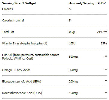 Other Ingredients: Gelatin (softgel), Glycerin, Purified water, Aqueous coating (Modified cellulose, Fractionated coconut oil [non-hydrogenated], Sodium alginate, Stearic acid)